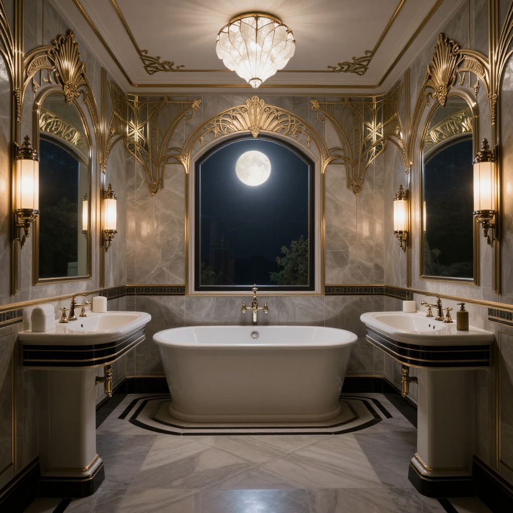 Art deco bathroom, photo, ultra detail, photoreal, professionally retouched, soft moonlight lighting, wide angle, 8 k high definition, insanely detailed, intricate, elegant, art by artgerm and wlop