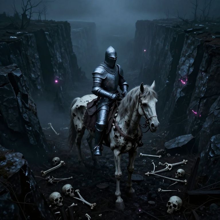 A surreal fusion of haunting nocturnal landscapes and eerie desolate scenes, a spectral knight clad in tattered, ethereal armor rides a decaying skeletal steed through an isolated, fog-draped realm. Captured from an aerial viewpoint above jagged cliffs and crumbling rocks that encircle them, this scene emphasizes their solitude within this unsettling otherworldly domain. The haunting glow of distant neon lights reflects off the knight's armor, casting an eerie hue upon scattered bones and skulls littering the ground below, evoking a sense of dread and despair.