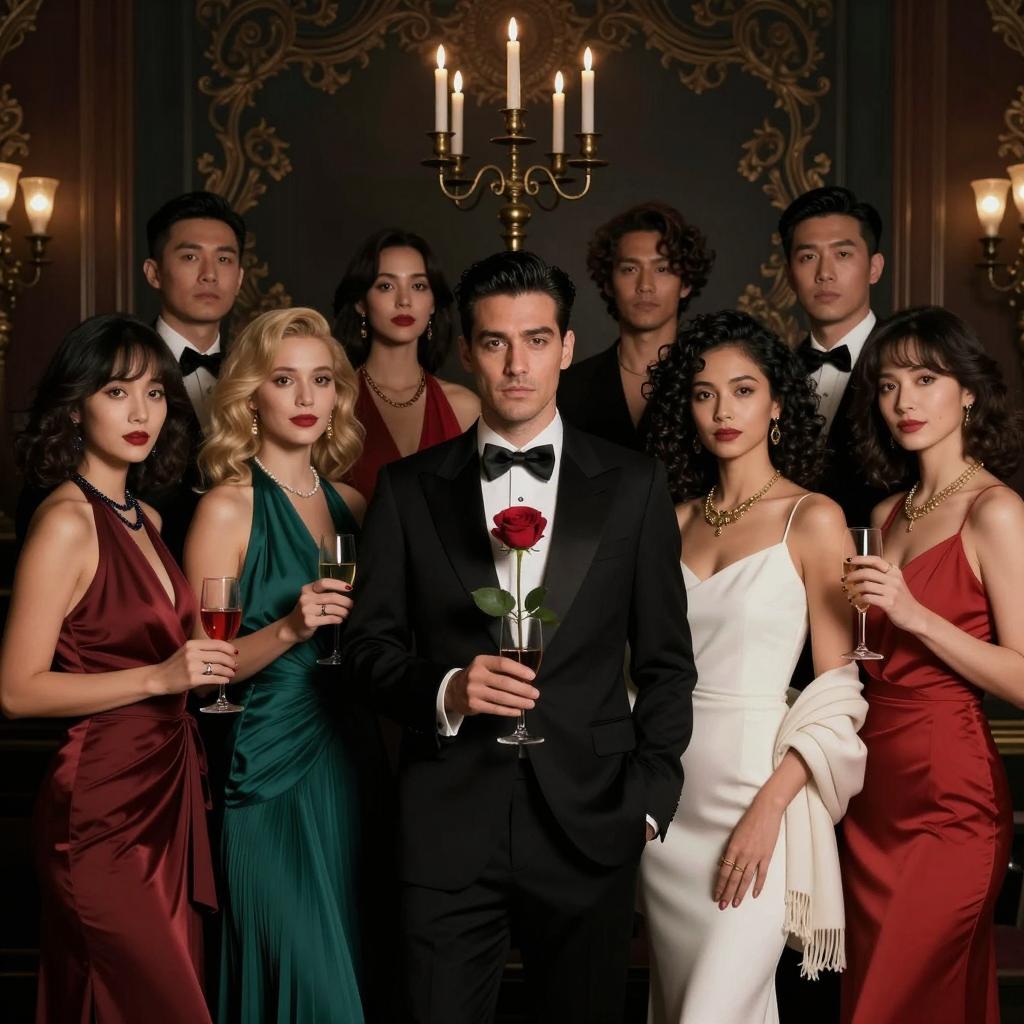 Casino scene with six people. Central man in striped suit, pink bowtie, and black hair, dealing cards. Two women in red and blue sequined dresses with feathered hats, standing. Two men in red and brown suits, black hats, seated. One man with back to viewer, gray suit, black hat, standing. Green poker table, chips, glass, and lamp in background. Women have large breasts, men in formal attire. Intense expressions on central man and woman in blue dress. Vintage, dramatic lighting.