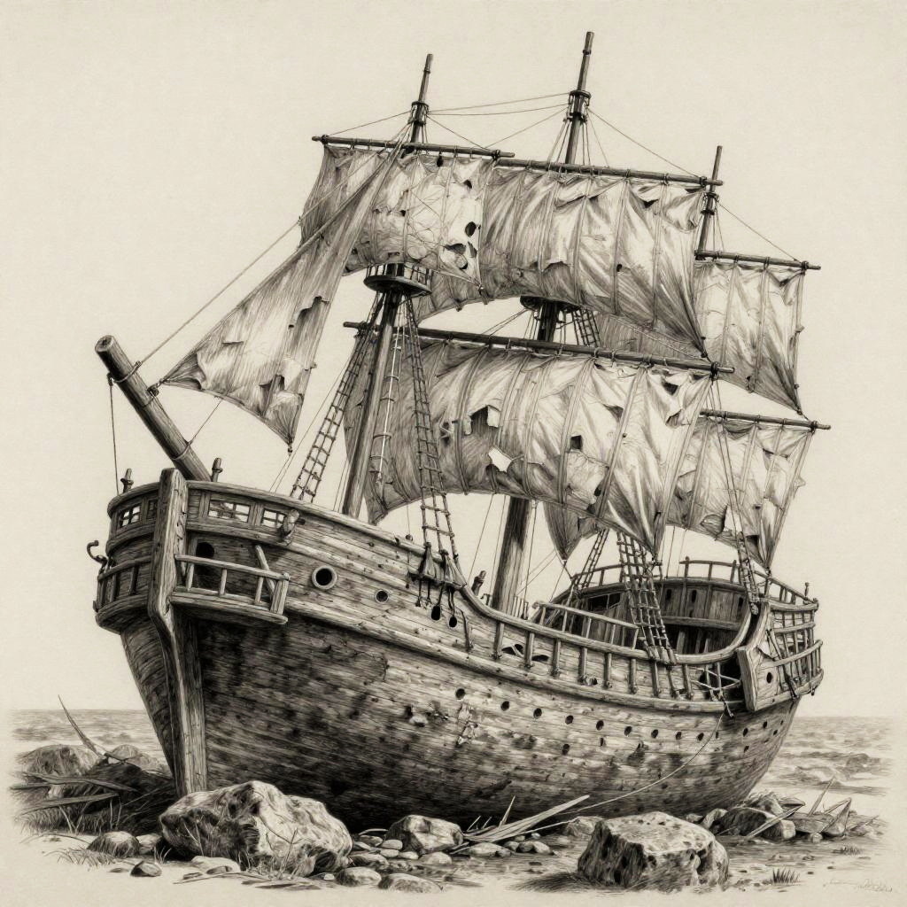 Ship pencil drawing illustrating a classic wooden shipwreck on a rocky shore, detailed textures of broken wood and weathered sails, atmospheric shading highlighting the eerie and abandoned mood.