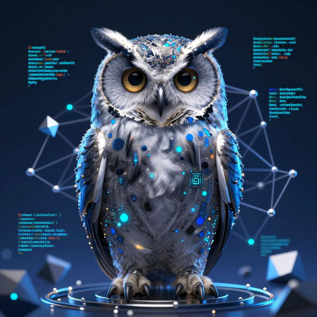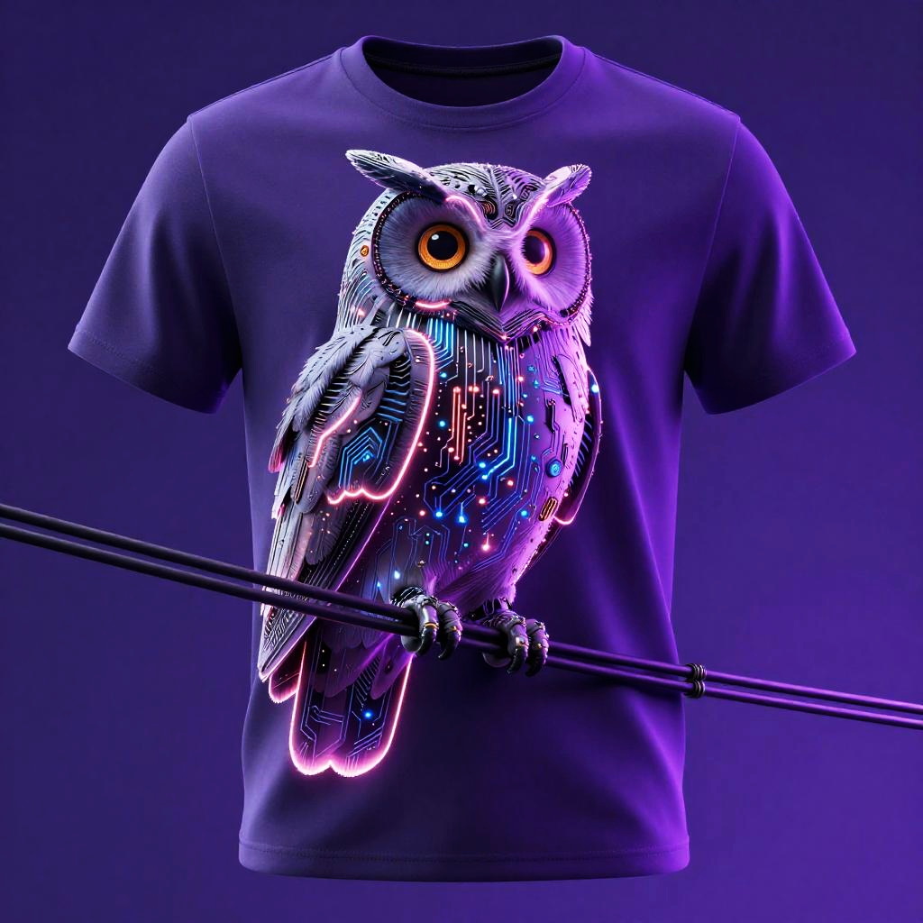 AI t-shirt motif of a cybernetic owl perched on electric wires, emitting neon light, detailed feathers made of circuits, set against a deep purple background, combining nature with futuristic AI elements in a surreal digital art style.