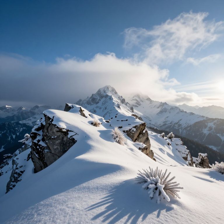 Brocken summit in winter, snow-capped rocks and frozen alpine plants, cold blue sky, low sun casting long shadows, atmospheric perspective with swirling clouds, serene yet dramatic mountain scene, photorealistic style