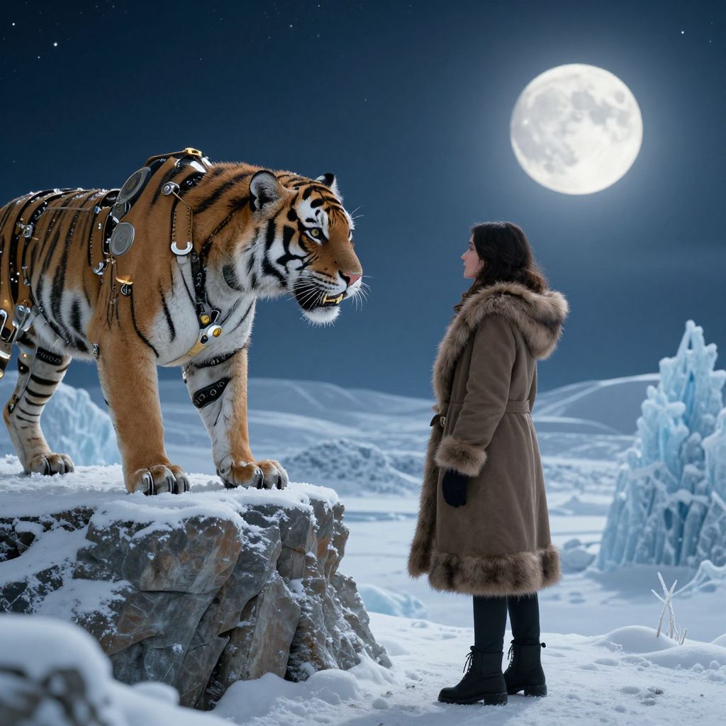 A woman in a fur-lined coat stands on a snowy cliff, gazing at a mechanical Siberian Tiger, with a moonlit, icy landscape and planet Arrakis in the background, inspired by Dune.