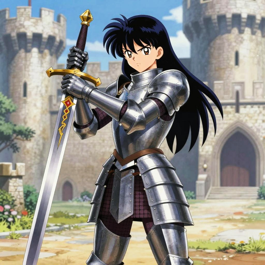 Anime-style drawing of a black-haired woman in silver armor holding a sword, standing in front of a medieval castle. Bright blue sky and greenery in