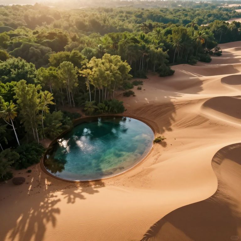 Aerial photograph of a serene, circular freshwater pool nestled in a sandy, desert-like landscape surrounded by dense, green tropical forest. The sun casts a warm, golden light, creating long shadows on the smooth, undulating sand dunes. The pool's clear, turquoise water contrasts with the surrounding orange-brown sand. The forest's lush, green foliage extends to the horizon, where sunlight filters through the trees, enhancing the tranquil, natural beauty of the scene. The image captures the interplay between water, sand, and forest in a stunning, picturesque composition.