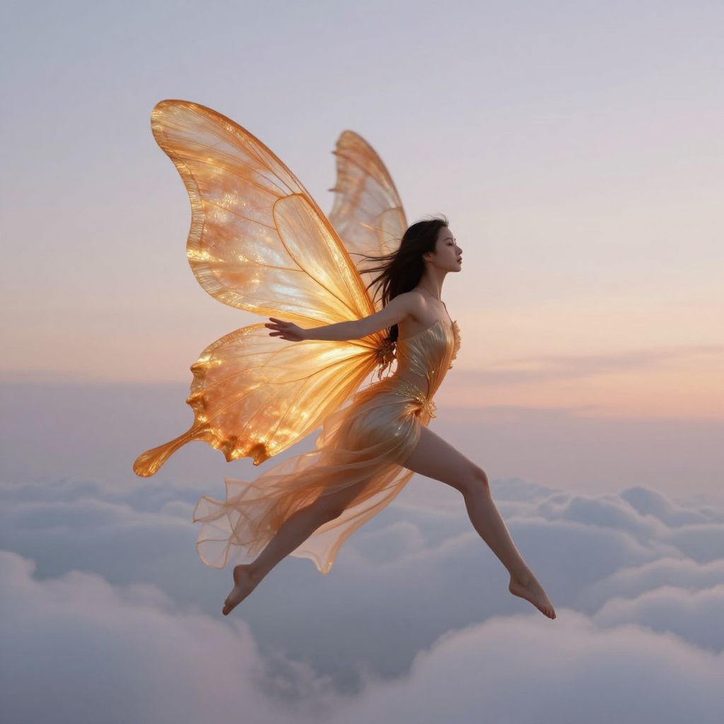 Ethereal woman glides gracefully above the clouds, her translucent butterfly wings shimmering with hues of gold and orange as she floats serenely against the backdrop of a soft, twilight sky.