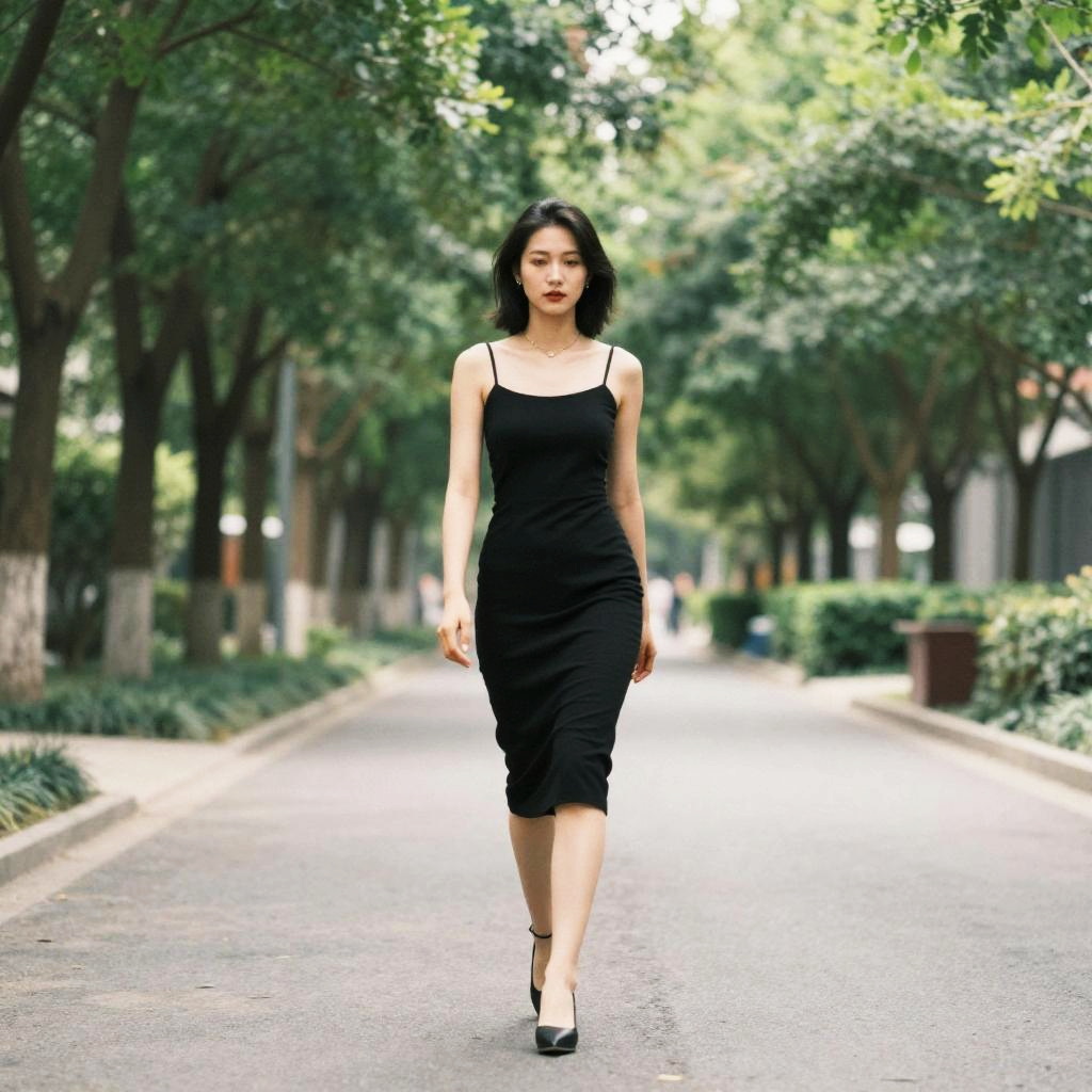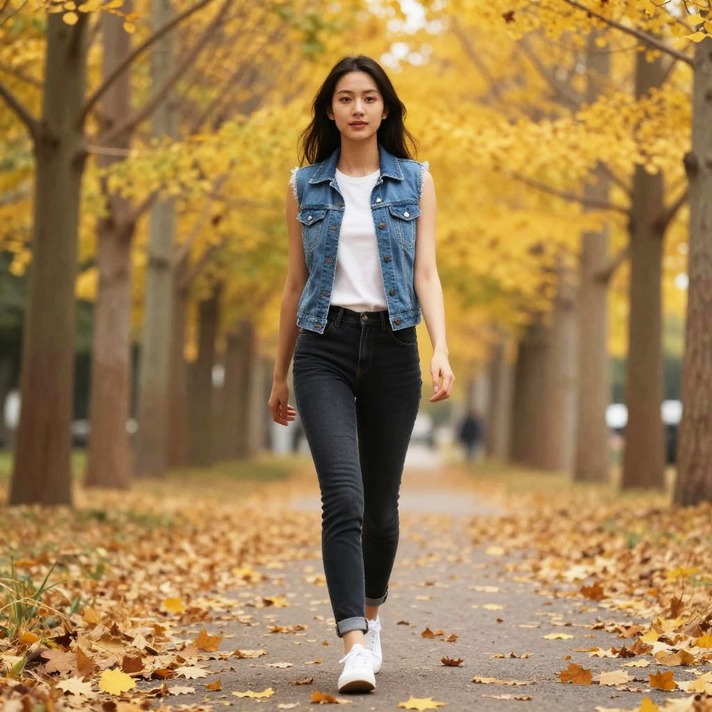 A young woman walks confidently down a tree-lined path covered with autumn leaves, dressed casually in a denim sleeveless shirt, dark jeans, and white sneakers. The vibrant yellow foliage and soft natural light create a warm and inviting fall atmosphere in this candid outdoor portrait.
