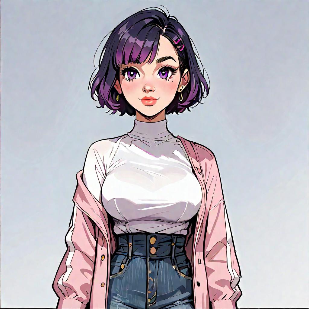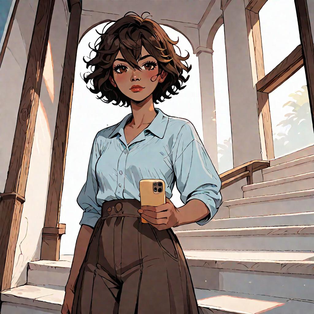 Score_9, score_8_up, score_7_up, score_6_up, source_anime, anime screencap, 1girl, looking at viewer, brown skin, holding cellphone, expressionless, brown hair, brown eyes, hair between eyes, curly hair, messy hair, small breasts, short hair, walking, stairs, walking down stairs