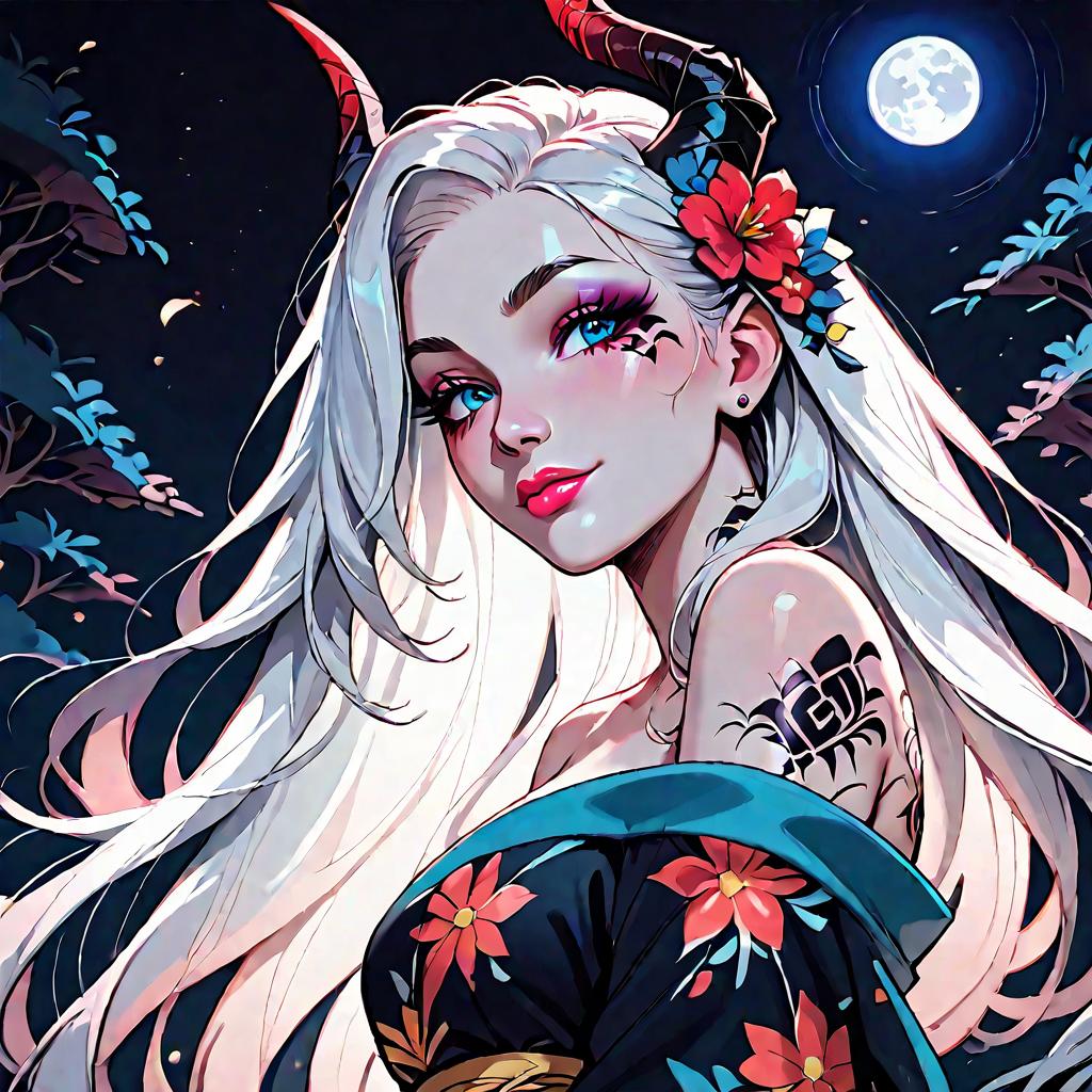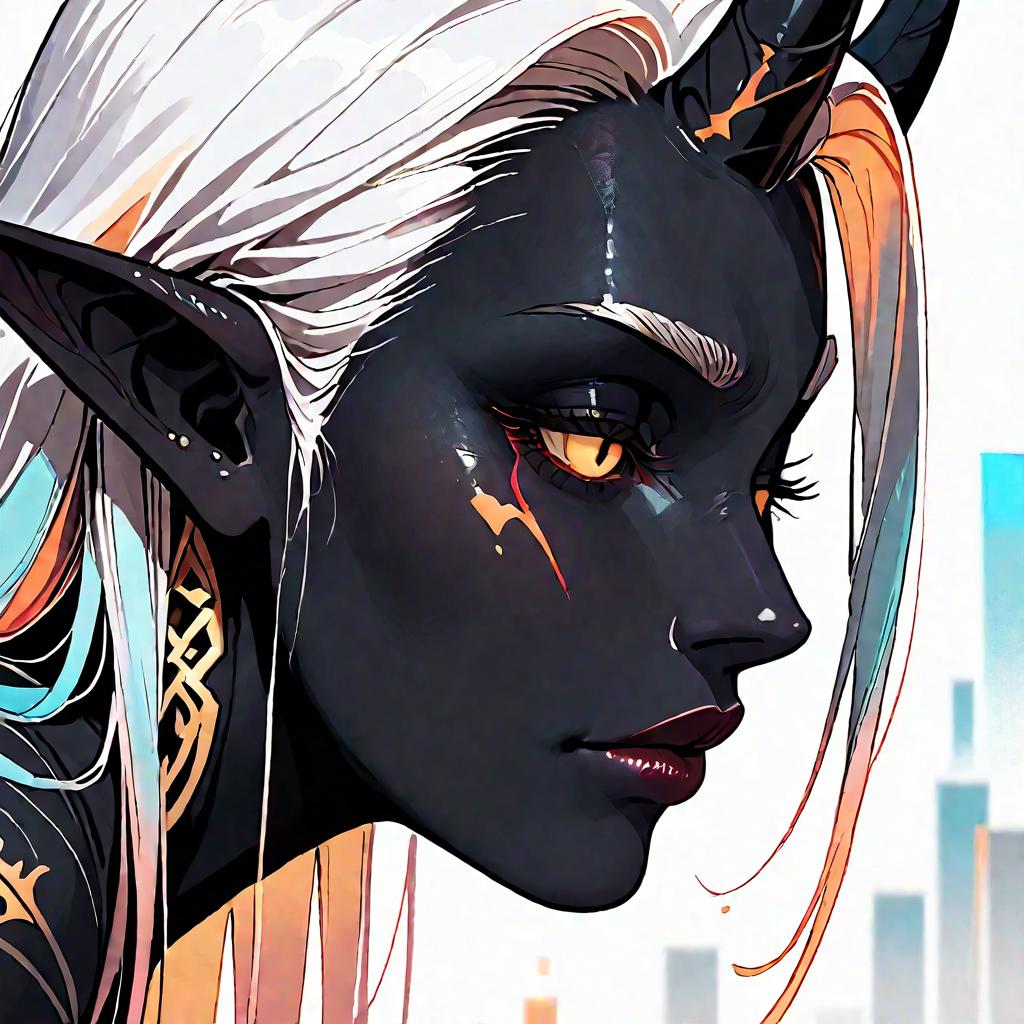 Artistic close-up digital illustration of a 20-year-old tiefling demon woman with black skin, glowing yellow eyes, and a broken right horn. The character has white hair, elf-like pointed ears, and detailed facial tattoos with a natural skin texture. The image features a surreal, dreamy style with soft lighting and subtle ghosting effects, highlighting the hyperrealistic details and fantasy elements.