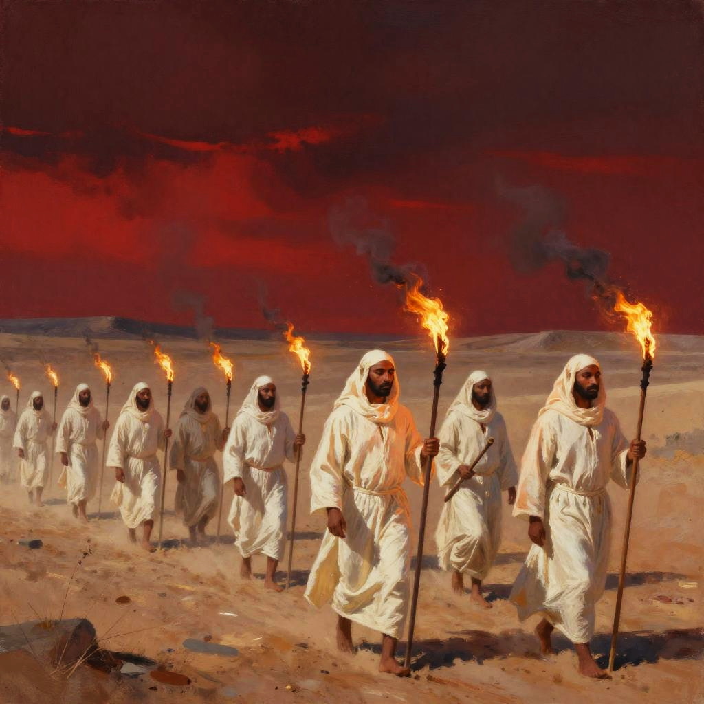 White robe cult procession through a desert under a blood red sky, robed silhouettes carry staffs and torches, vast barren landscape, ominous and mysterious vibe, painterly style