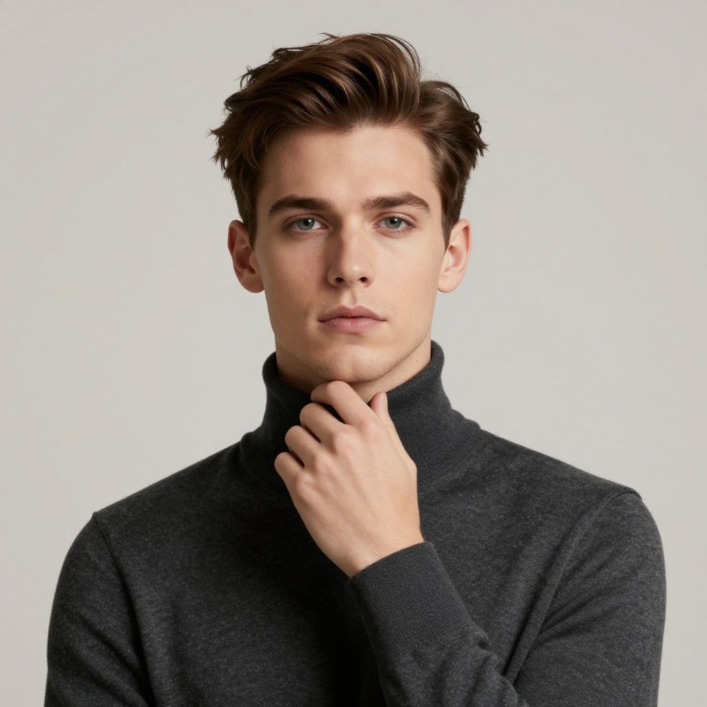 Photograph of a young Caucasian man with fair skin and brown, neatly styled hair. He has light blue eyes and a slightly serious expression. He wears a dark charcoal gray, high-neck turtleneck sweater. His right hand is gently touching the collar of his sweater. The background is a clean, white studio setting, highlighting the subject. The image focuses on his upper body and face, with sharp lighting and minimal shadows, giving a modern, polished look. The man's facial features are symmetrical and he appears to be in his early 20s.