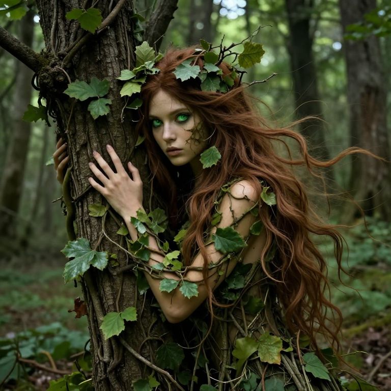 The image depicts a captivating scene of a dryad, a mythical forest spirit, transforming into a tree. The dryad has striking green eyes and long, flowing brown hair adorned with leaves and branches, blending seamlessly with the natural surroundings. Her face is partially obscured by the intertwining leaves and vines, creating a sense of unity with the forest. The background is a lush, deciduous forest, with trees and foliage extending into the distance, enhancing the ethereal and mystical atmosphere. The overall composition is harmonious, with the dryad's body and the forest elements intermingling, suggesting a deep connection between the spirit and the natural world. The interplay of colors, textures, and shapes creates a visually rich and dynamic scene, capturing the essence of the dryad's transformation into a tree.