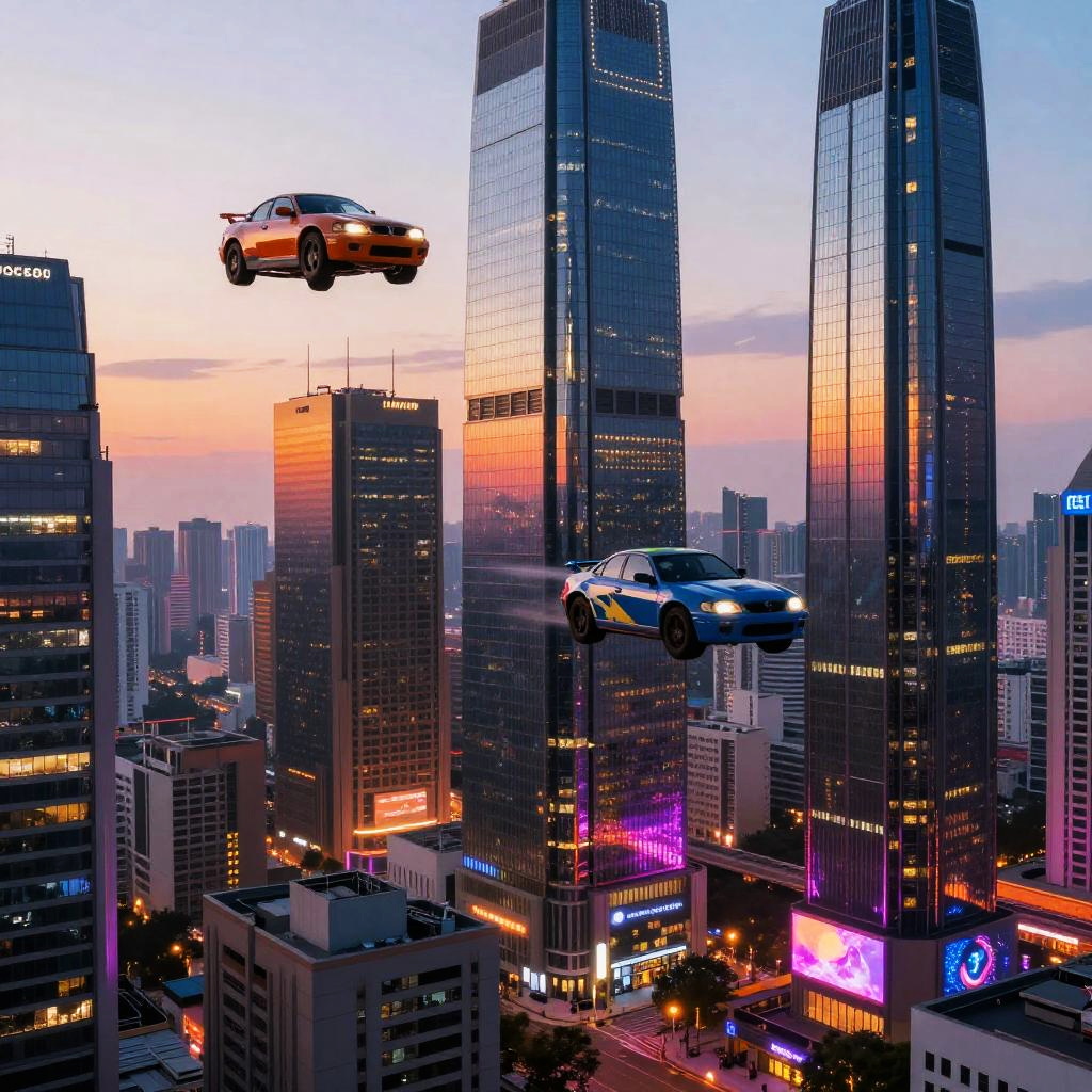 Ask AI to draw a futuristic cityscape at sunset, with glowing skyscrapers and flying cars, vibrant neon colors and dynamic reflections on water, showcasing advanced technology in a utopian environment, highly detailed and cinematic.