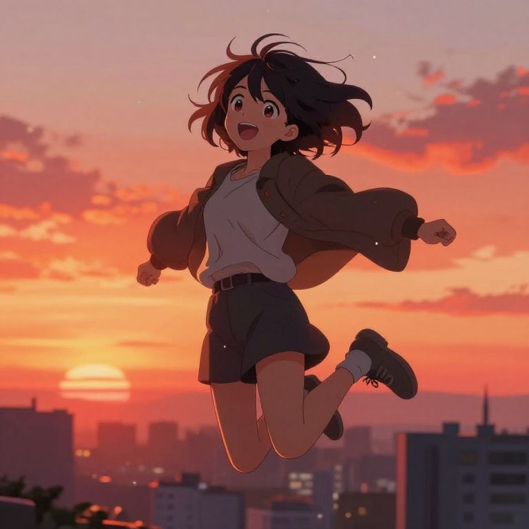 Lonely anime character sitting on a rooftop at sunset, soft warm tones, melancholic atmosphere with wind gently moving hair and clothes, detailed city skyline in background, detailed textures on fabric and skin, emotional and introspective mood, painterly anime style.