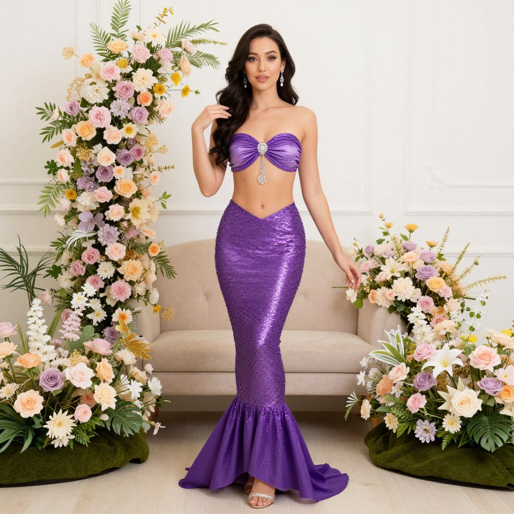 Photograph of a beautiful woman with long, wavy black hair, standing in front of a white wall. She wears a shimmering purple mermaid-style dress with a strapless, bow-tied top and a sequined, form-fitting skirt that flares out at the bottom. Her skin is fair, and she has a slim, hourglass figure. She stands confidently with one hand on her hip and the other gently touching her hair. The background features an ornate arrangement of colorful flowers, including roses, daisies, and lilies, framed by lush greenery on either side. A cream-colored sofa is positioned behind her, enhancing the elegant and festive atmosphere.