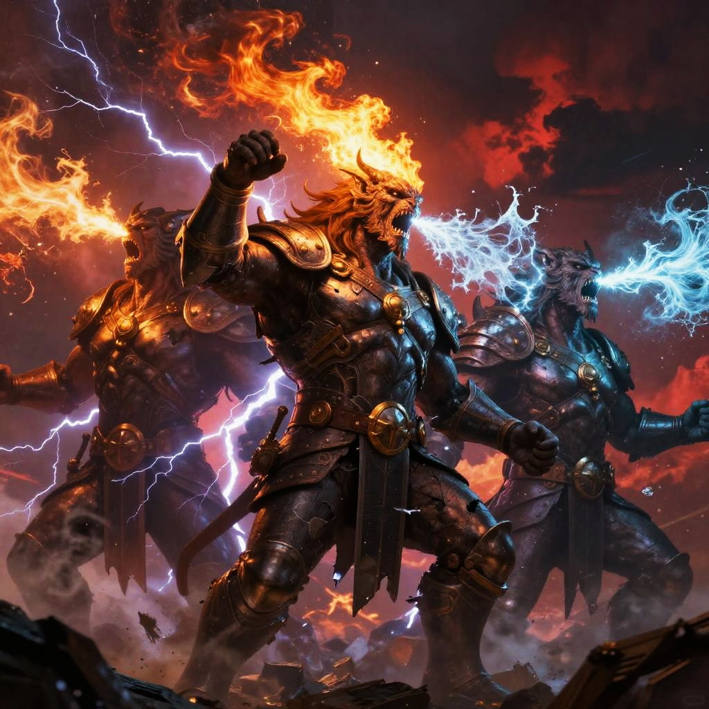 Three headed giant in a stormy battlefield, lightning striking around its colossal frame, one head breathing fire, one head emitting icy breath, one head roaring thunder, torn armor, dramatic red skies, dynamic action shot, fantasy illustration