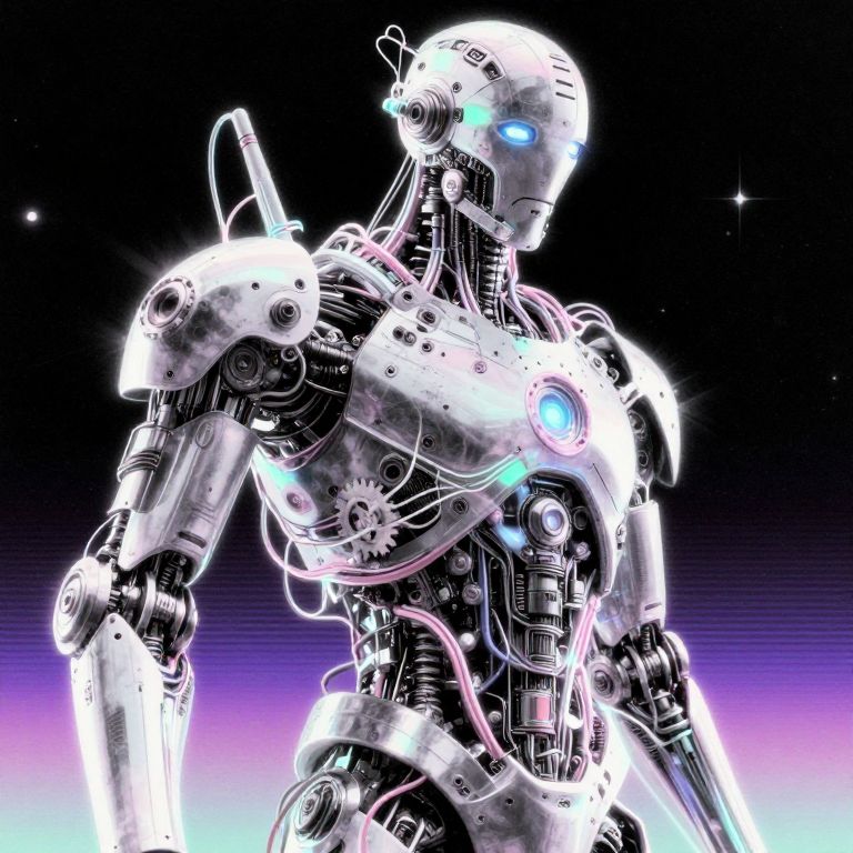 Digital drawing of a cyberpunk-style character with a white, mask-like face featuring black, cartoonish lips and a mustache. The character has two beige, curved horns on their head and wears a black, armored suit with visible mechanical details and green-blue glowing accents. The character's eyes are covered by high-tech, cylindrical goggles with one red and one blue lens. The background is a gradient of light blue to white, adding a futuristic feel. The image has a vibrant, high-contrast style with bold lines and a slightly glossy texture.