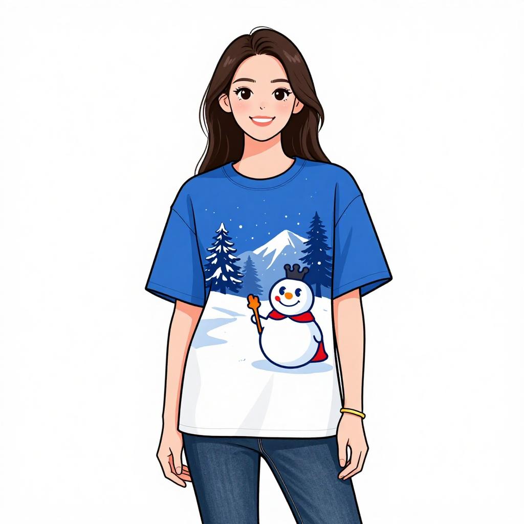 Digital illustration of a smiling woman with long brown hair, wearing a blue winter-themed T-shirt with a snowman, and dark jeans, against a white