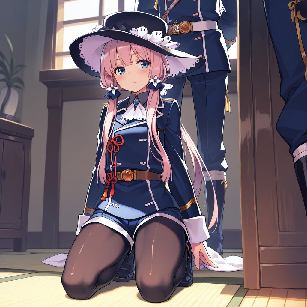 An anime-style illustration of a young girl with pink hair and blue eyes, wearing a detailed blue military uniform with gold accents and white gloves. She is kneeling on the floor in a room with traditional Japanese decor. The girl wears black pantyhose under shorts and a wide-brimmed hat adorned with white frills and flower decorations. Behind her, a partial view of another person in a matching military uniform is visible.