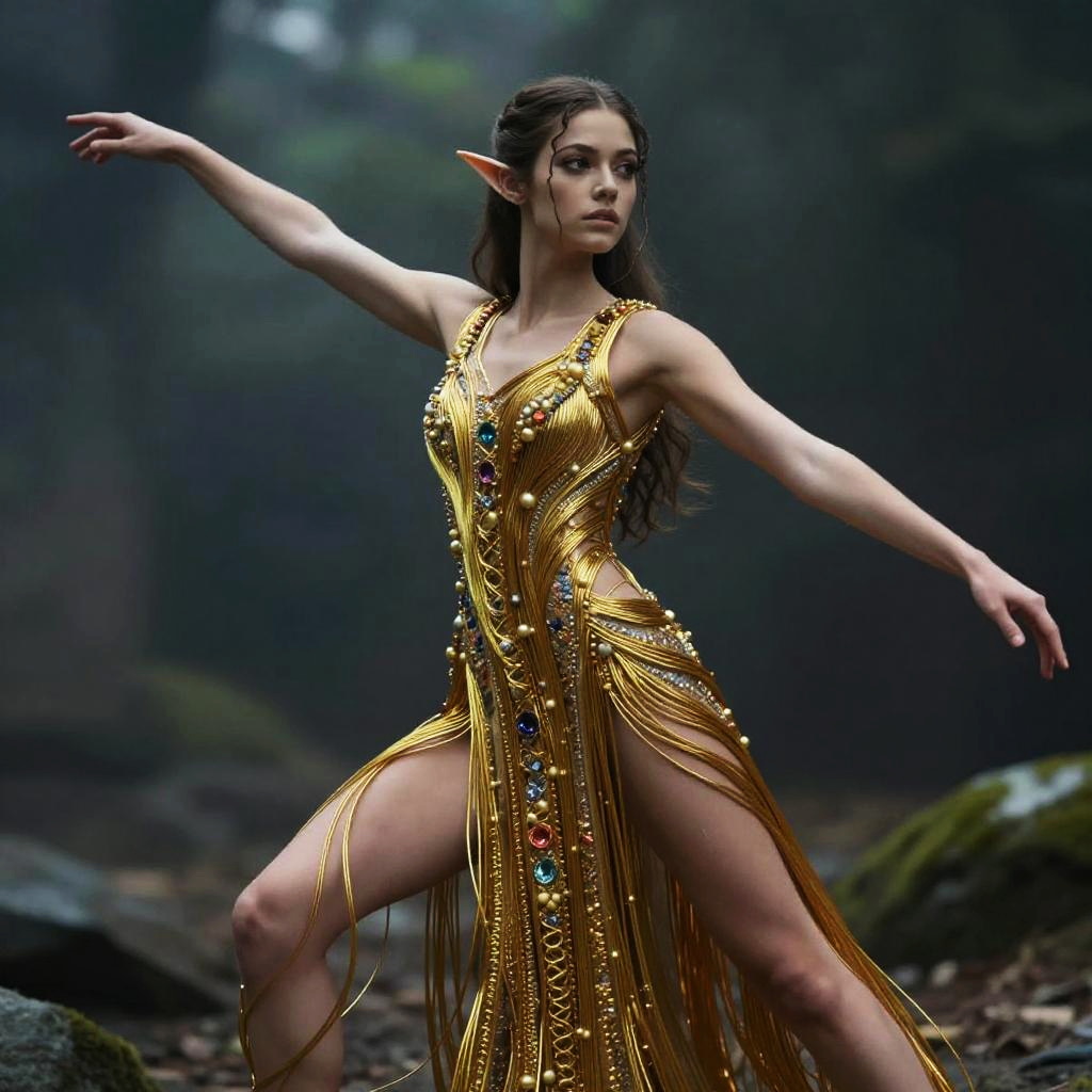 Photograph of a fantasy elf woman with pointed ears, wearing a golden, beaded, and fringe dress adorned with colorful gemstones, in a dark, misty forest. She has long, dark brown hair, pale skin, and a confident, poised stance with one arm extended and the other bent. Her dress, which is form-fitting and revealing, showcases her slender, athletic physique. The background is blurred, featuring dark green foliage and rocks, adding to the mystical atmosphere. The image has a high-contrast, dramatic lighting, emphasizing the elf's elegant and otherworldly appearance.