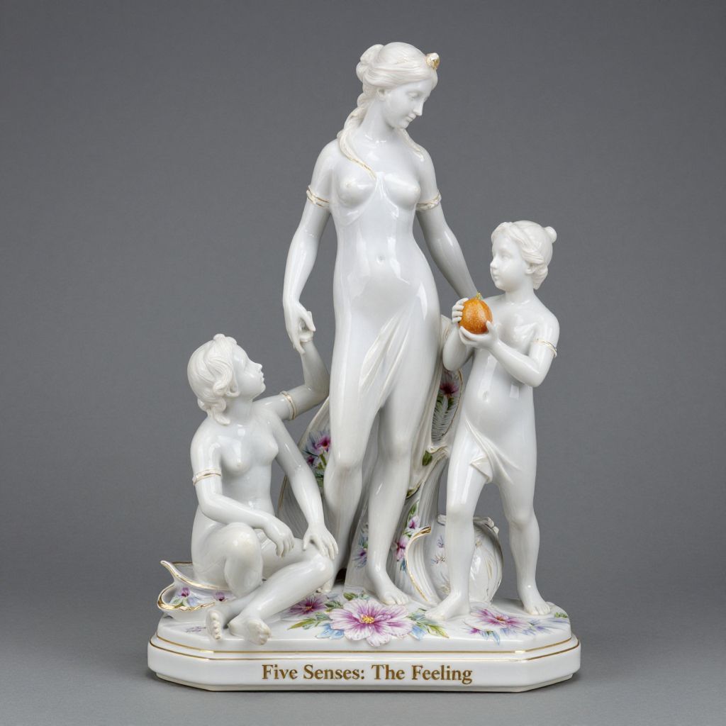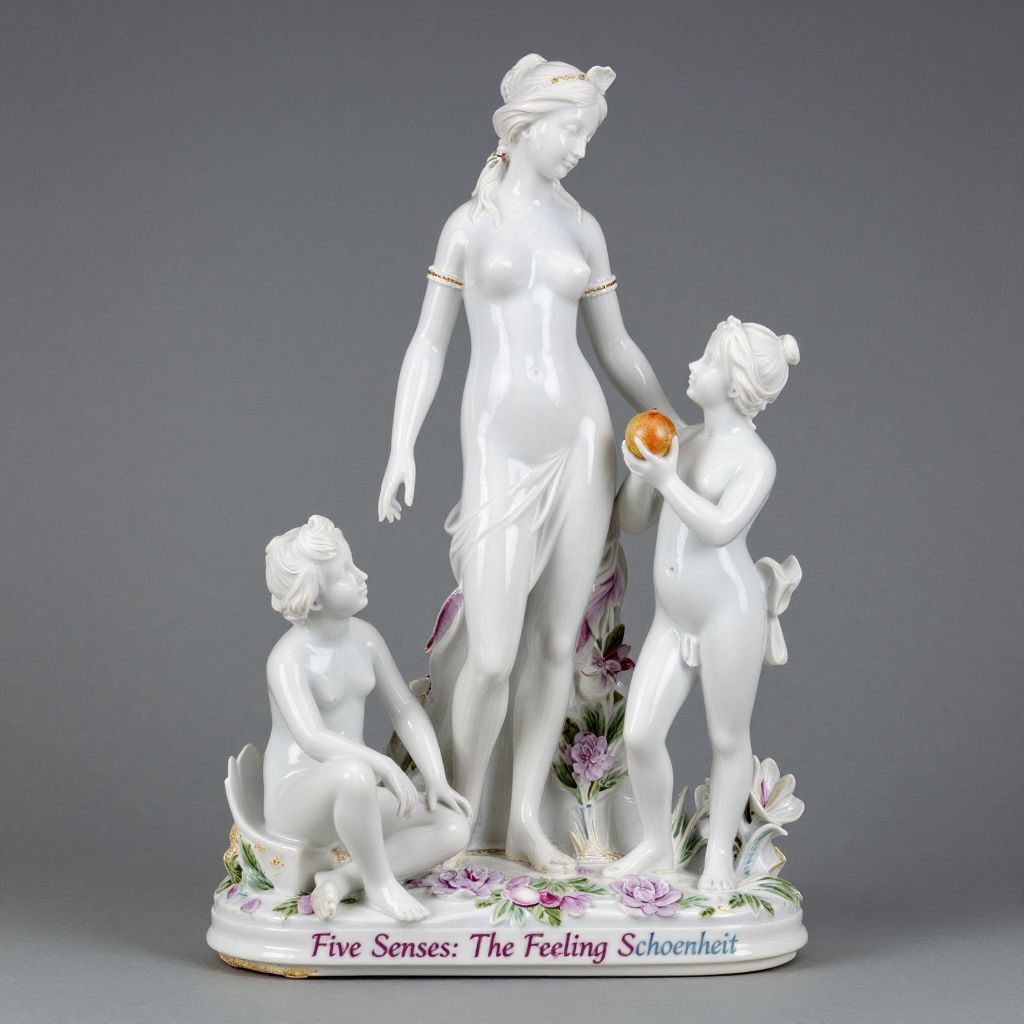 Meissen porcelain sculpture titled \"Five Senses: The Feeling\" by Schoenheit, featuring three nude figures—a standing woman and two children—one seated and one standing with a fruit, all set against a floral base, crafted circa 1840-1850.