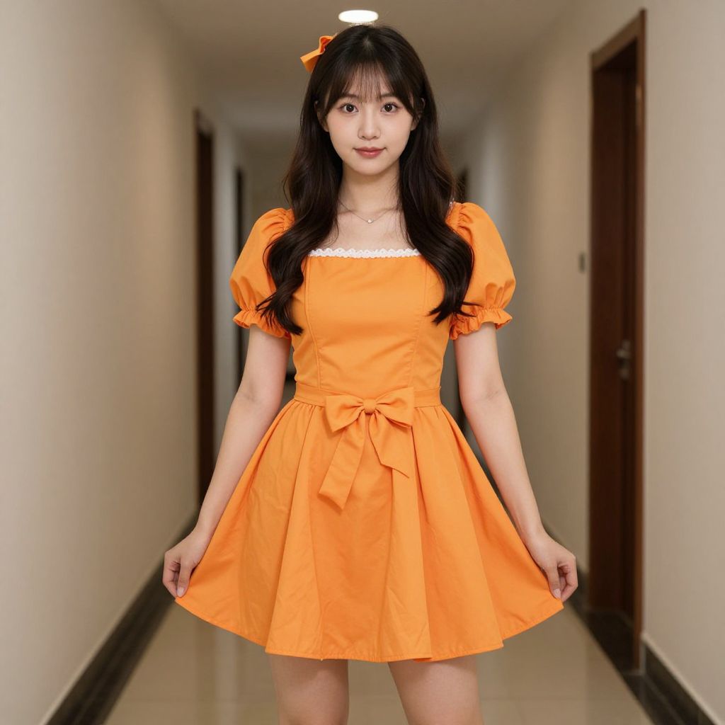 Photograph of an Asian woman standing in a long, narrow, beige-walled hallway with wooden doors on both sides. She has long, straight black hair with bangs, adorned with a small orange bow. She wears an orange, short-sleeved, flared dress with a white lace trim on the neckline and a bow tie at the waist. Her dress is bright and contrasts with the muted hallway. She stands centered, facing the camera, with a neutral expression, and her hands are gently holding the sides of her dress. The floor is a glossy beige tile. The lighting is even, with a single ceiling light overhead.