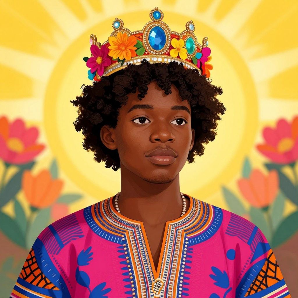 A vibrant digital illustration of a young African man with natural curly hair, wearing a colorful crown decorated with flowers and gemstones. The subject is dressed in a bright patterned outfit with pink, blue, and orange colors. The background features stylized floral elements and a radiant yellow sunburst pattern, emphasizing the regal and cultural theme.