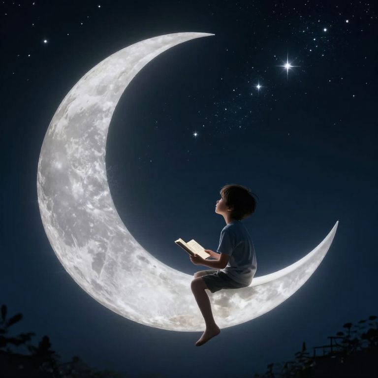 A digital illustration depicts a young boy with curly hair and a blue shirt, sitting barefoot on a glowing, luminous crescent moon. He is holding an open book and looking at it with a focused expression. The background is a deep, star-filled night sky, with several bright stars scattered around. The crescent moon has a textured, crater-like surface, illuminating the boy and casting a soft light. The image combines elements of fantasy and realism, creating a magical, dreamlike atmosphere. The boy is positioned to the right of the moon, which dominates the center of the image.