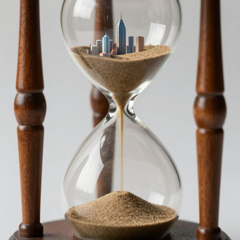 Photograph of a clear glass hourglass with brown sand, positioned between two wooden chair legs. Inside the upper glass bulb, a miniature cityscape featuring a tall blue skyscraper and other buildings is partially covered by sand. The sand flows from the upper bulb to the lower one. The background is a bright white, contrasting with the dark wood of the chair legs and the clear glass of the hourglass. The image conveys a sense of time passing, with the cityscape symbolizing the passage of time affecting urban development.