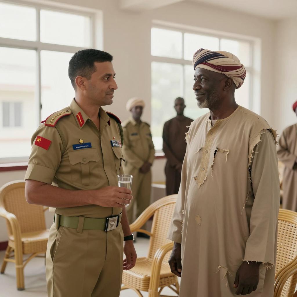 Two men in beige military-style uniforms stand inside a corrugated metal shed, facing each other. One man gestures with his right hand. Outside, a blue military Jeep and a red-covered cargo are visible. Two other men in similar uniforms are in the background. The shed has a large rectangular cutout. Wicker chairs are in the foreground. The scene is sunlit.