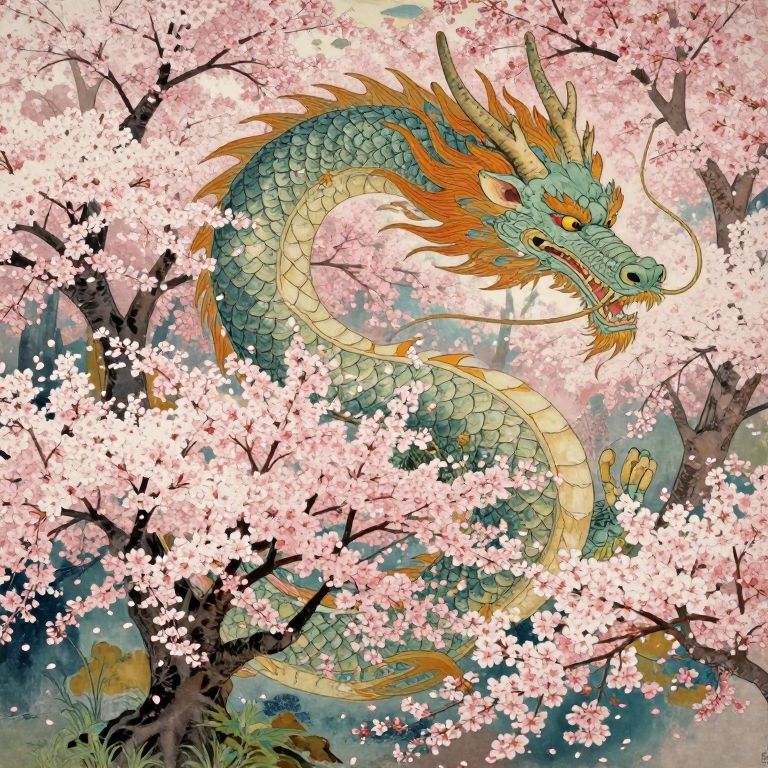 Imagine an enchanting digital art composition that masterfully combines elements of Art Nouveau and Japanese ukiyo-e prints. This captivating scene depicts a mythical creature emerging from a lush cherry blossom grove, with intricate details of the dragon's scales harmoniously blending into the vibrant petals of blooming sakura trees. Viewed from an aerial perspective, this emotional journey transitions gracefully from serene and enchanting to awe-inspiring and powerful, reflecting both the ethereal beauty of nature and the commanding presence of the mythical beast that rules over it.