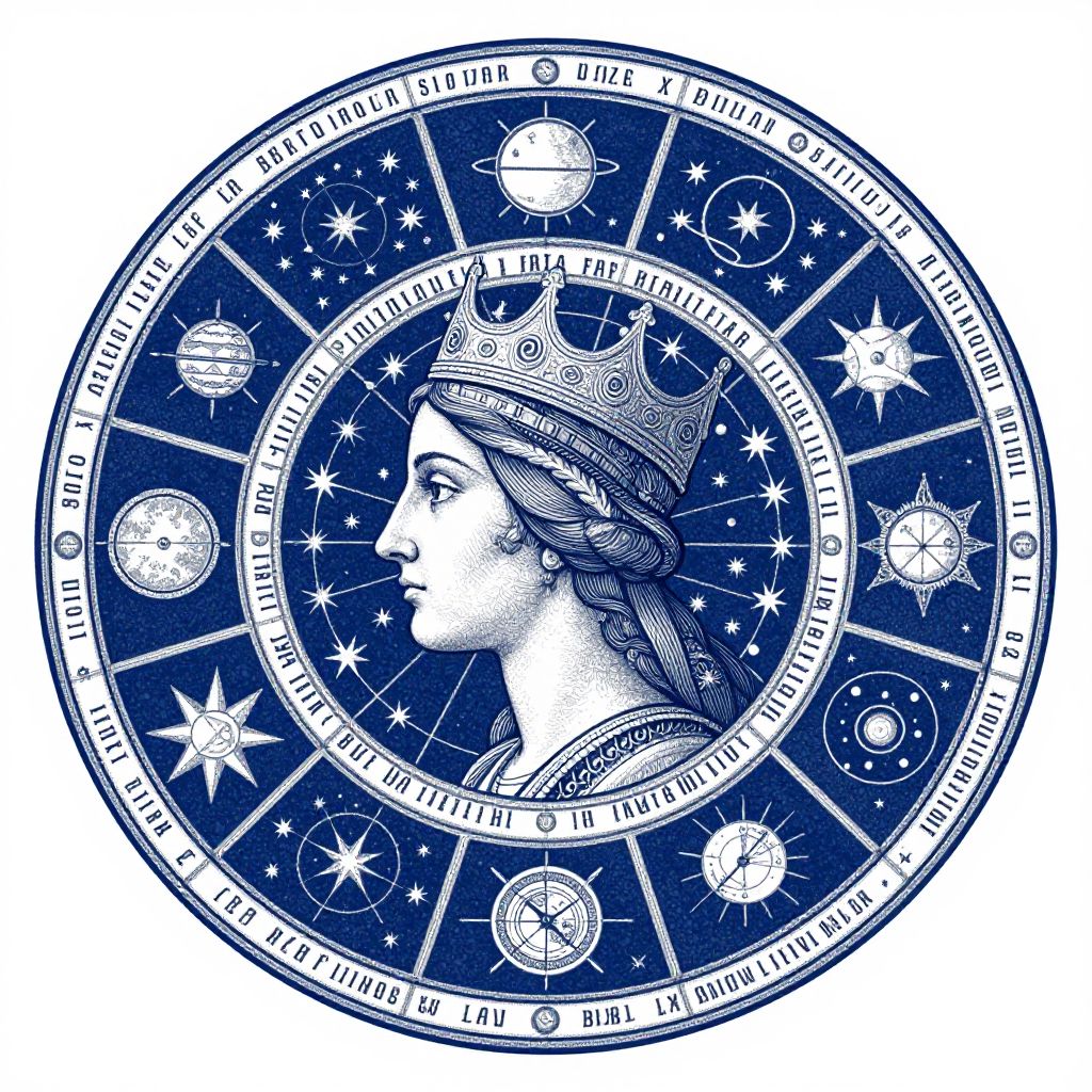 The image presents a highly detailed and intricate illustration reminiscent of an alchemical or esoteric manuscript. Dominating the center is a profile of a woman's head, adorned with a crown and intricate hairdo, set against a deep blue background. Surrounding the profile is a circular wheel divided into eight segments, each containing various symbols, diagrams, and celestial motifs. These symbols include stars, planets, and geometric shapes, rendered in white and silver accents that contrast sharply with the blue. The wheel is adorned with text and numerals, suggesting a complex system of notation or alchemical recipes. The overall composition is balanced, with the woman's profile serving as the focal point, while the surrounding symbols and text create a sense of depth and complexity. The use of white and silver on the blue background enhances the visual impact, making the intricate details stand out. The image evokes a sense of ancient wisdom and esoteric knowledge, reminiscent of medieval or Renaissance alchemical texts.