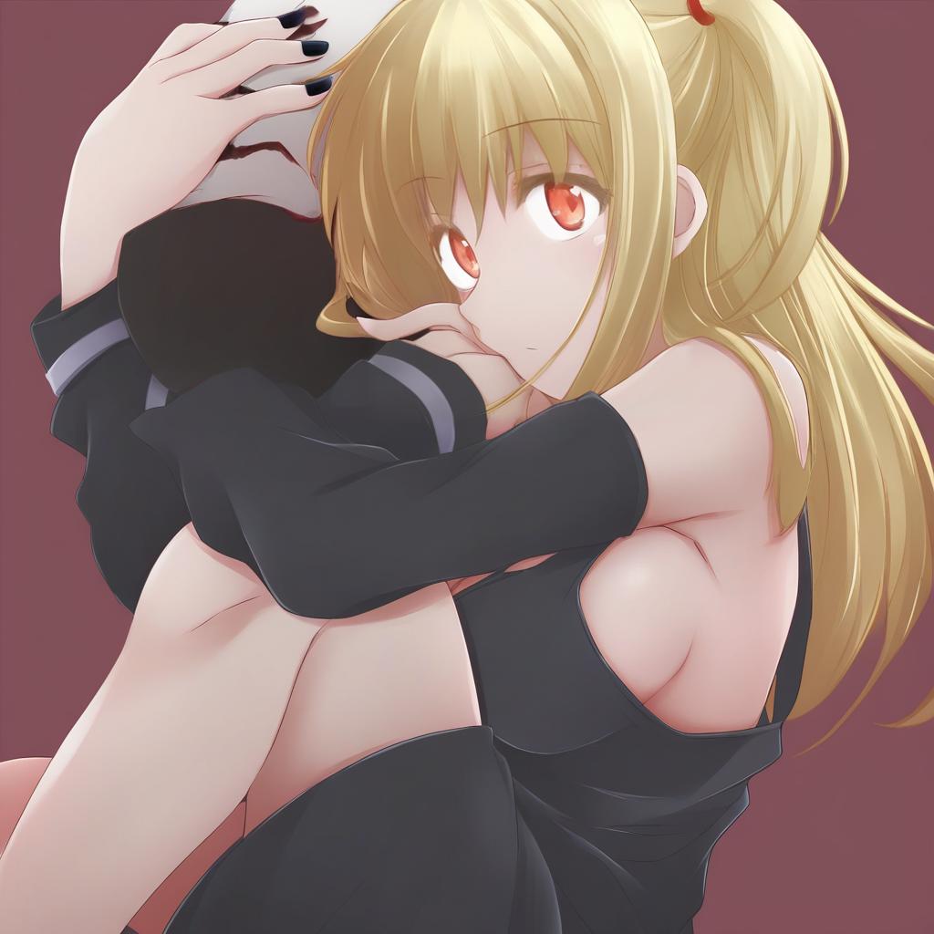 Amane misa, death note, 1girl, red eyes, blonde hair, long hair, two side up, medium breasts, black dress, bare shoulders, detached sleeves, nail polish, goth fashion, goth fashion, by artist hazuki haru, leet