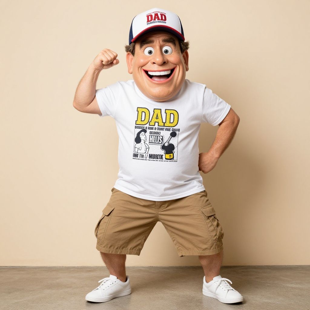 Photograph of a Caucasian man with a jovial expression, wearing a white baseball cap with "DAD" in red letters, a white T-shirt with "DAD" and a cartoon graphic, beige cargo shorts, and white sneakers. He stands against a plain beige wall, with one arm flexed and the other hand on his hip, smiling widely with exaggerated, cartoonish eyes. His short brown hair peeks out from under the cap. The floor is gray concrete, and the lighting is bright, highlighting his cheerful demeanor.