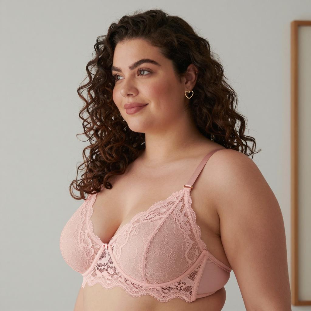 Photograph of a curvy woman with fair skin and dark curly hair. She wears a pink lace bra, revealing her large breasts. She looks over her shoulder with a slight smile. Her right ear has a gold heart-shaped earring. Background is a plain light gray wall with a wooden frame on the right.