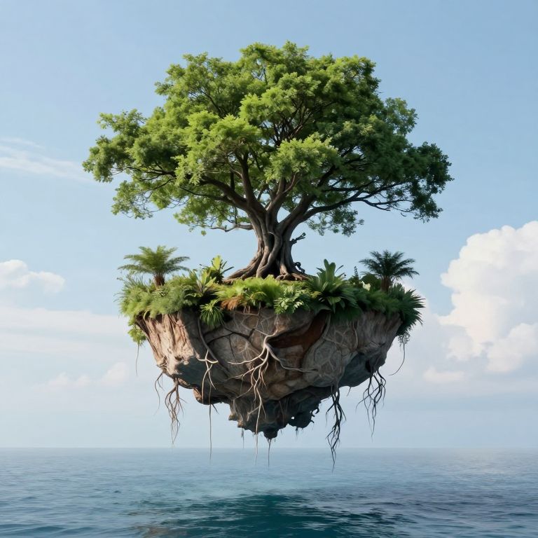 Digital artwork of a floating island with a large, lush green tree, surrounded by small plants, roots dangling, set against a clear blue sky and calm