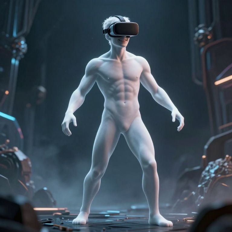 A digital CGI image features a muscular, nude, white-skinned male standing in a futuristic, dimly lit environment. He wears a black virtual reality headset, obscuring his eyes. His physique is well-defined with visible abs, pecs, and muscular legs. His genitals are subtly outlined but not explicit. The background includes blurred, glowing blue and orange lights, and metallic structures, creating a sci-fi atmosphere. The light source from above highlights his body, casting soft shadows. The overall style is highly detailed and realistic, emphasizing the character's physicality and the futuristic setting.