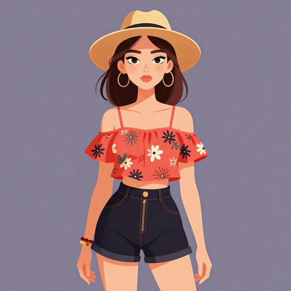 Digital illustration of a young woman with fair skin, wearing a straw hat, red off-shoulder floral top, and black high-waisted shorts