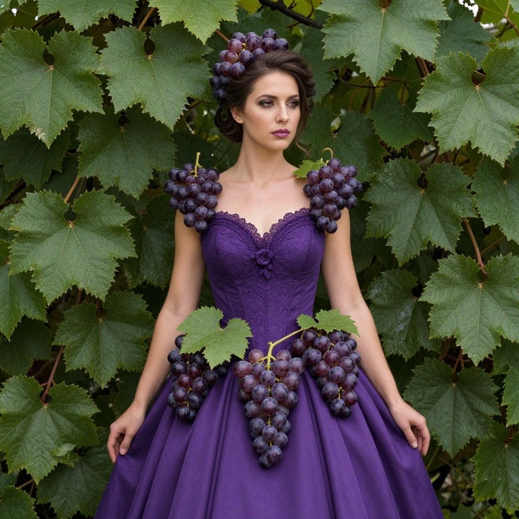 This striking image features a woman adorned in an elaborate purple dress, intricately designed with clusters of grapes and surrounded by lush green leaves. The vibrant colors and creative composition give it a surreal, artistic quality, evoking themes of nature and elegance. The unique styling embodies a fusion of fashion and botany, making it a captivating visual experience.