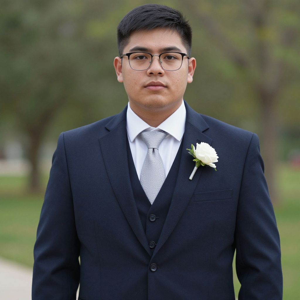 Photograph of a young Asian man with short black hair, glasses, wearing a black suit, white shirt, and tie, with a white flower bout