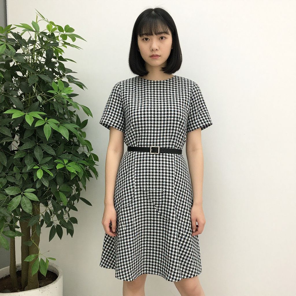 Checkered skirt outfit, 1girl, solo, checkered clothes, realistic, plant, asian, belt, looking at viewer, skirt, black hair, dress, checkered dress, short hair