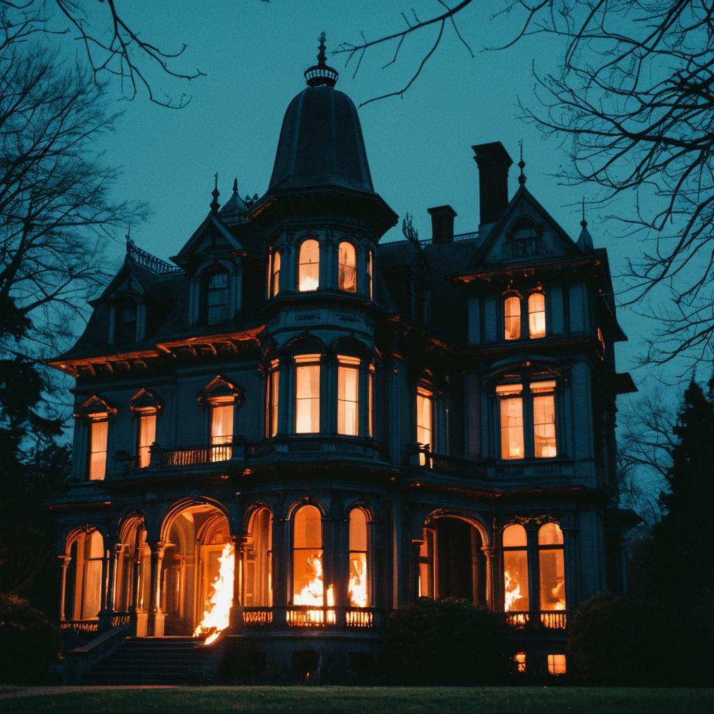 A large Victorian mansion engulfed in flames during the early evening. The house features intricate architectural details with tall windows and a prominent tower. The warm glow of the fire contrasts with the dim blue light of almost nightfall, creating a dramatic and eerie atmosphere. Bare tree branches frame the scene, enhancing the spooky aesthetic.