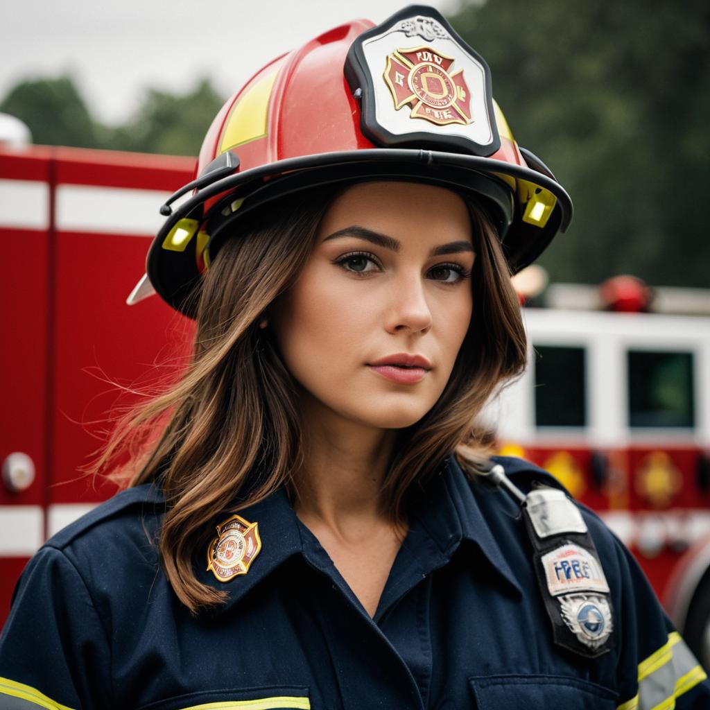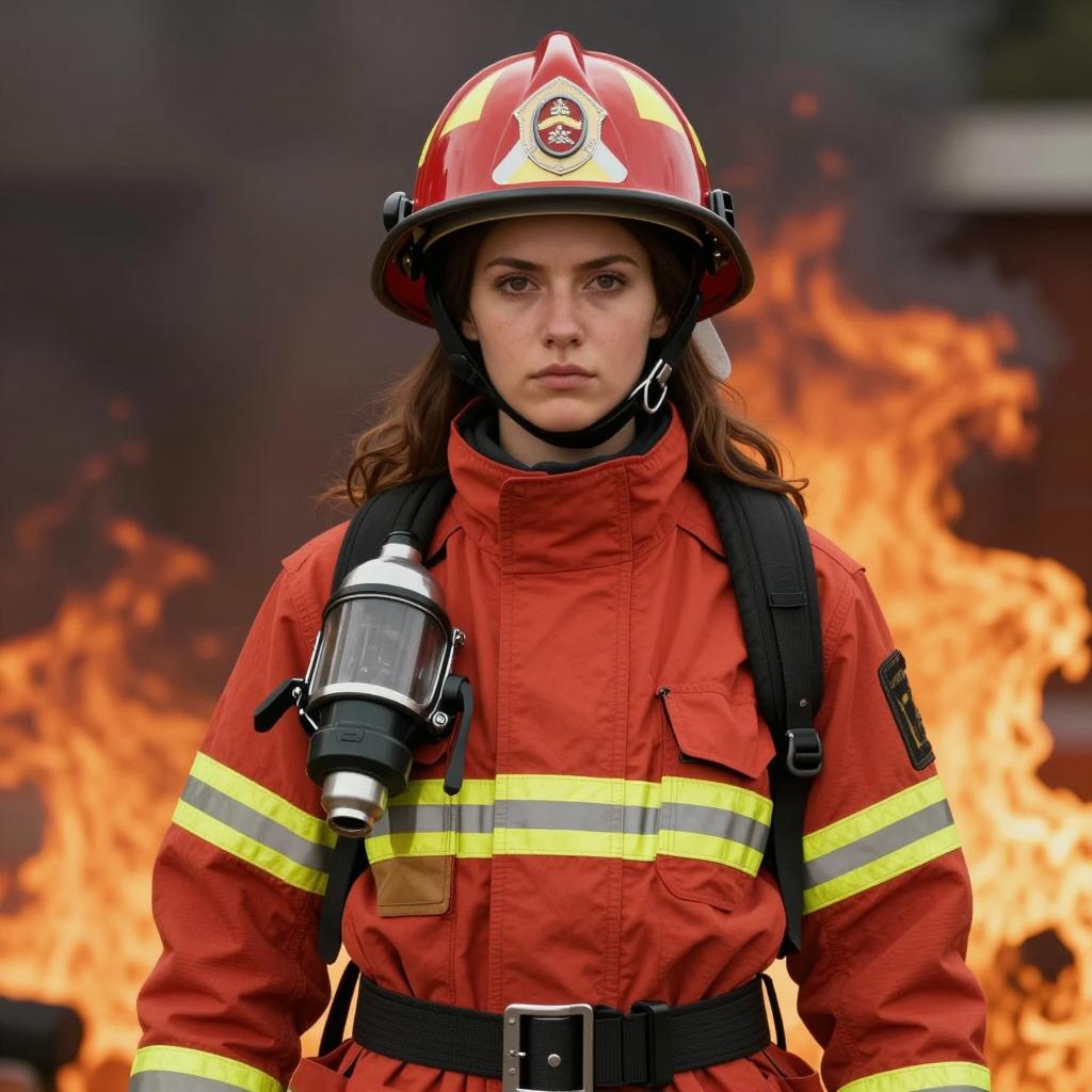 Fire fighter fancy dress, photorealistic, female firefighter, front view, wearing red helmet with emblem, long brown wavy hair, serious expression, red and yellow firefighting jacket with reflective stripes, tan pockets, oxygen mask on left chest, firefighting badge on right chest, background with blurred orange flames, realistic lighting, detailed ures, digital art, high quality, realistic style, SD/T2I, portrait, action hero, strong, brave, emergency response