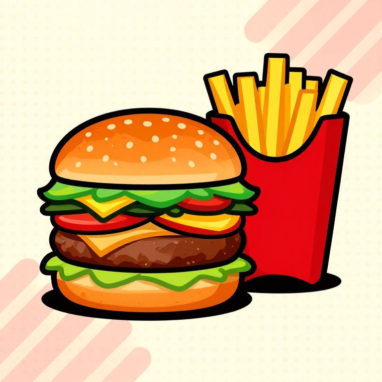 Colorful cartoon illustration of a cheeseburger with lettuce, tomato, cheese, and a beef patty, next to a red paper cup of French fries