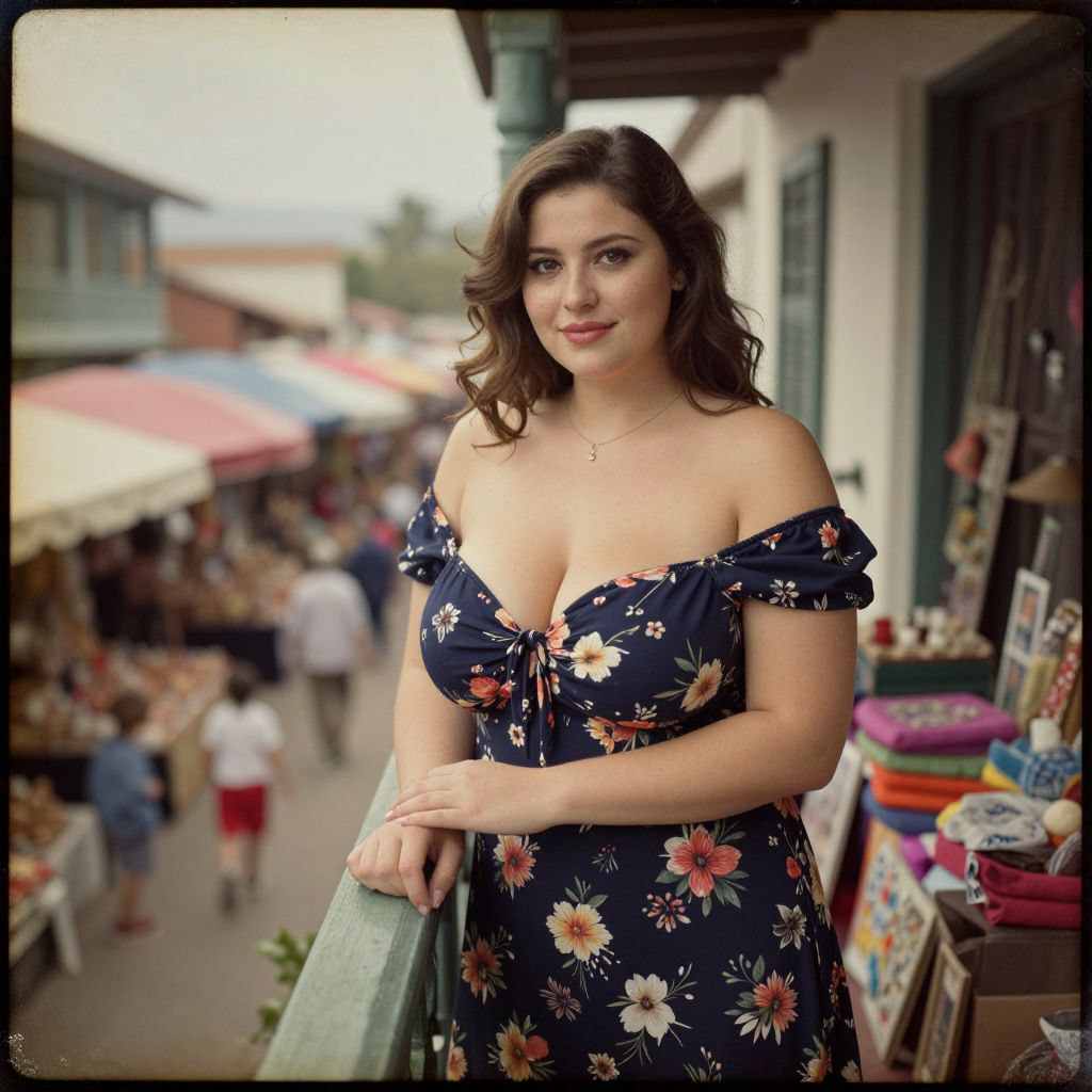 A curvy woman in a navy blue off-the-shoulder summer dress with a floral print stands on a balcony in a bustling market, enjoying the vibrant atmosphere. The scene is captured in the Calotype process, highlighting the soft, warm tones of the surroundings as she smiles while browsing the colorful stalls. Sexy. Pretty face and beаutiful eyes. Big breasts
