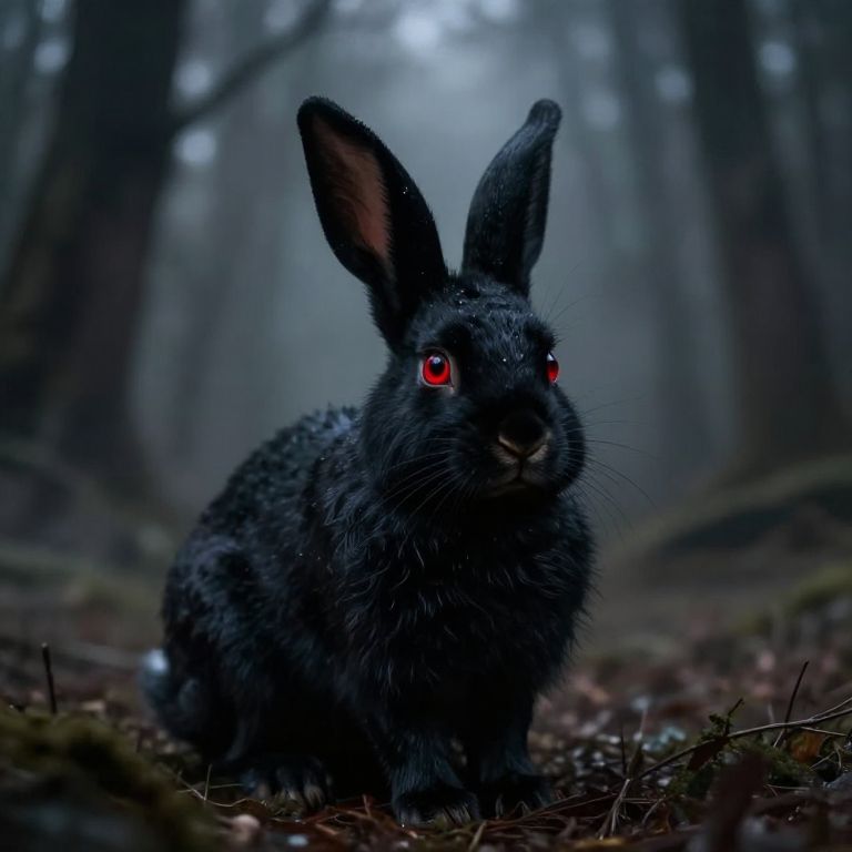 Black rabbit with red eyes surrounded by swirling dark mist in a foggy forest, mysterious and eerie ambiance, high contrast, dramatic lighting, fantasy dark art