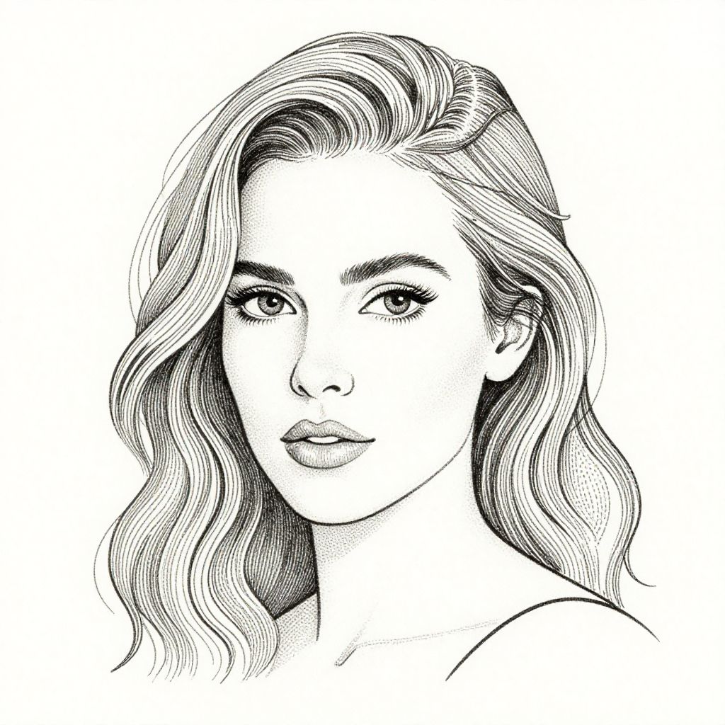 This is a black-and-white, highly detailed digital line drawing of a woman's face and upper shoulders. The subject has wavy, shoulder-length hair that cascades smoothly around her face. Her eyes are large and expressive, with well-defined eyebrows and subtle eyeliner. She has full lips with a slight, confident smile. The drawing uses fine, cross-hatched lines to add texture and depth to her hair and skin. The background is completely white, making the subject stand out prominently. The overall style is reminiscent of comic book or illustrative portraiture, with a focus on clean lines and expressive features.