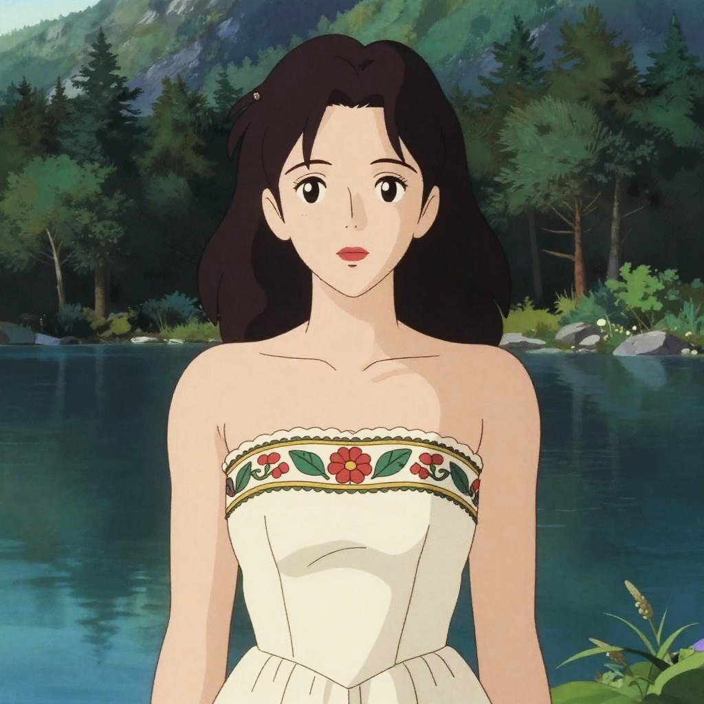 A woman, in a vintage-inspired strapless cream dress with an embroidered bodice, natural makeup, and loose wavy hair, standing by a mountain lake with a forest backdrop, in the style of Toei Animation. Sexy. Pretty face and beutiful eyes