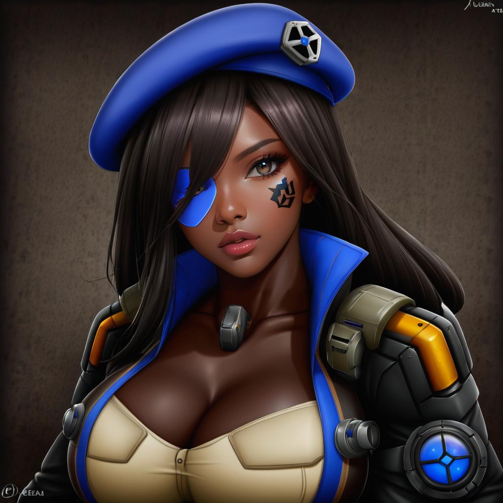 Photo-realistic full body cosplay of a dark-skinned female dressed as Ana from Overwatch. The costume is detailed with a blue and black bodysuit, matching blue beret, arm guards, and thigh holsters. The model has long black hair, facial tattoos, and striking brown eyes. The pose is confident with hands on hips.