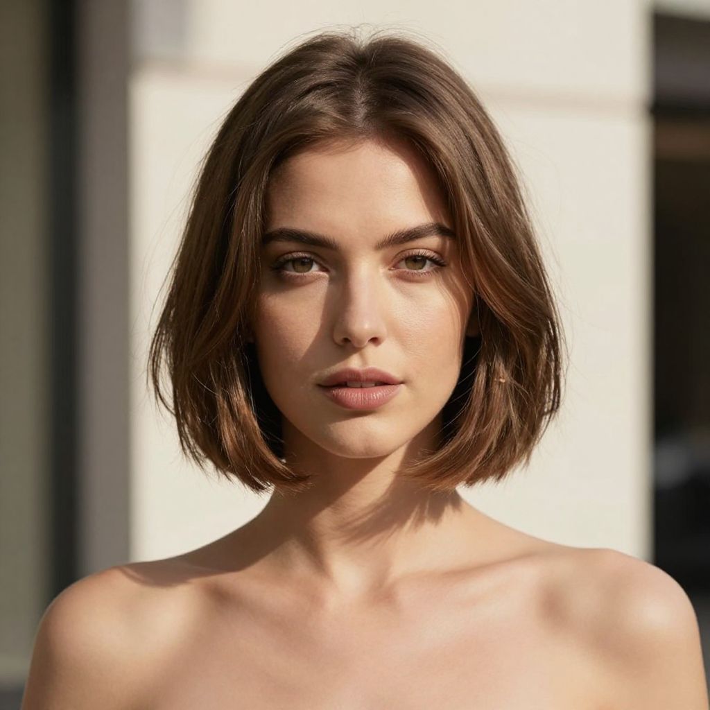 Caucasian woman with Volume-Boosting Bob hairstyle, emphasizing fullness and facial symmetry, perfect for narrow or oval face shapes, high-resolution, natural skin tone, warm daylight, elegant and modern fashion setting, balanced composition with soft shadows